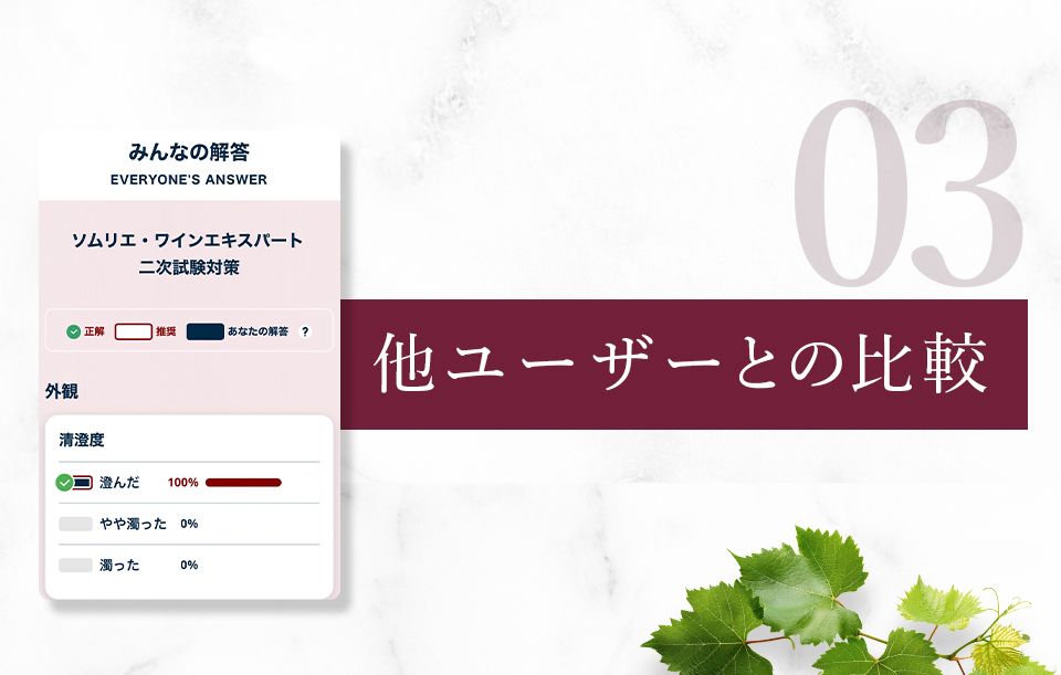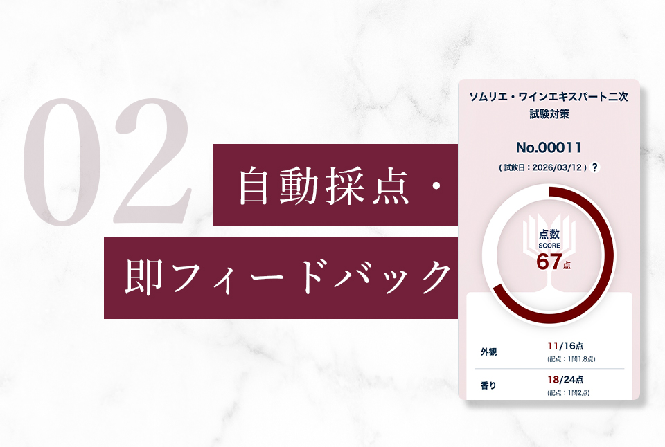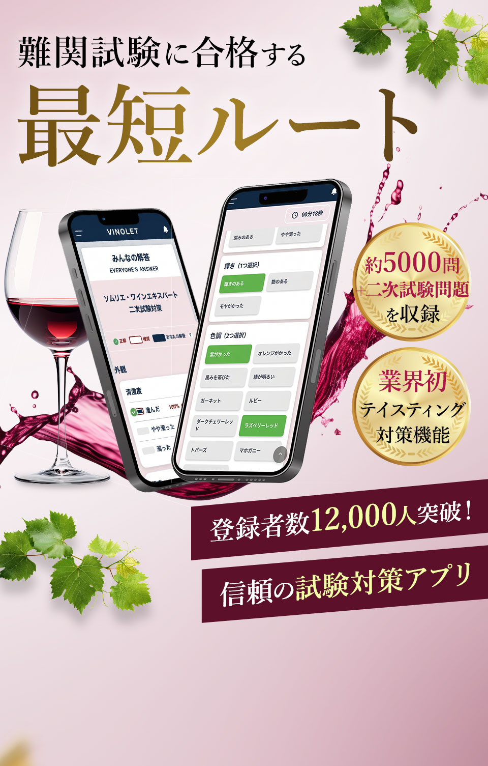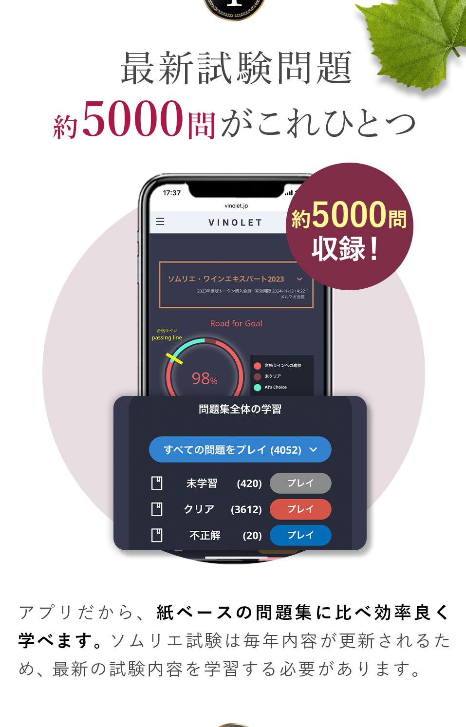 アプリだから、自分が合格圏内かどうかがひと目でわかり、 紙ベースの問題集に比べ効率よく学べます。ソムリエ試験は毎年内容が更新されるため、最新の試験内容を学習する必要があります。