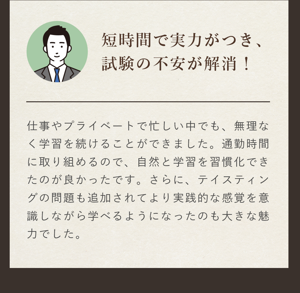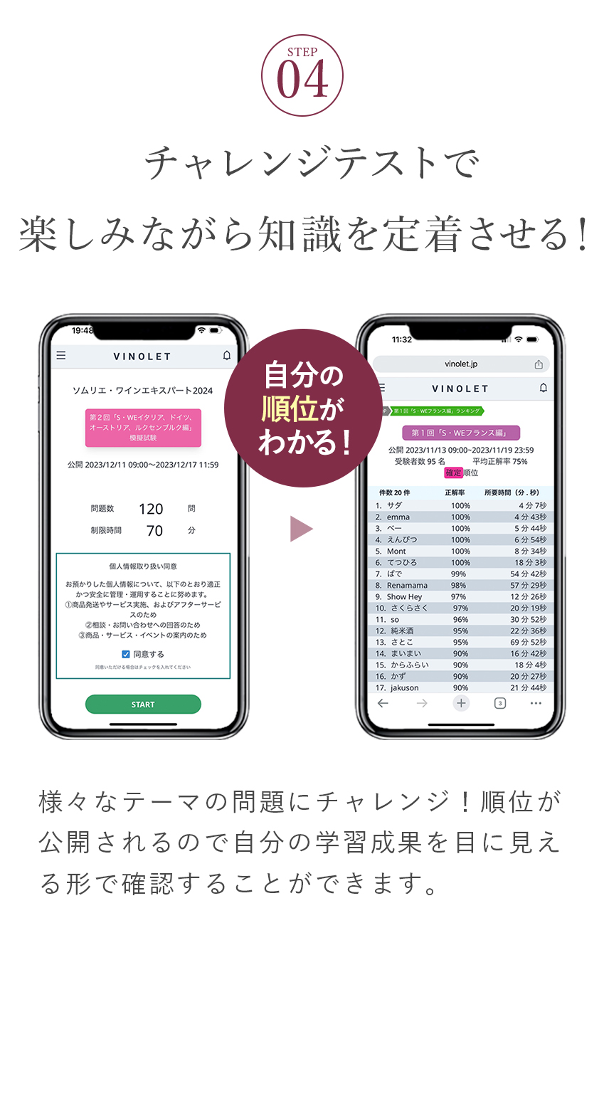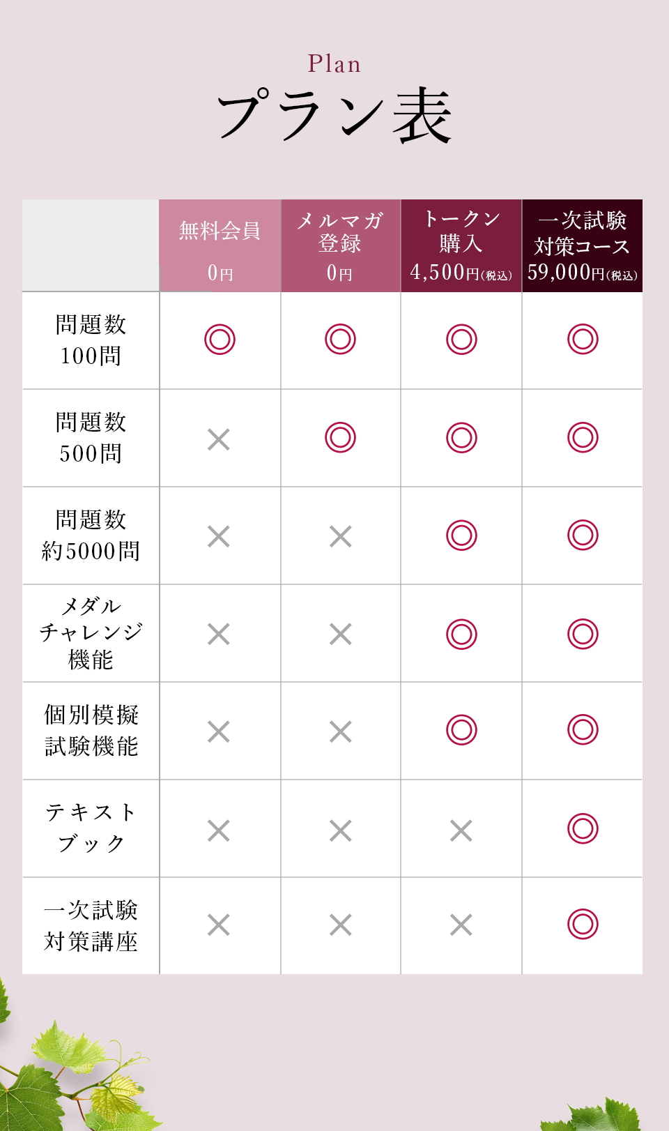 アプリだから、自分が合格圏内かどうかがひと目でわかり、 紙ベースの問題集に比べ効率よく学べます。ソムリエ試験は毎年内容が更新されるため、最新の試験内容を学習する必要があります。