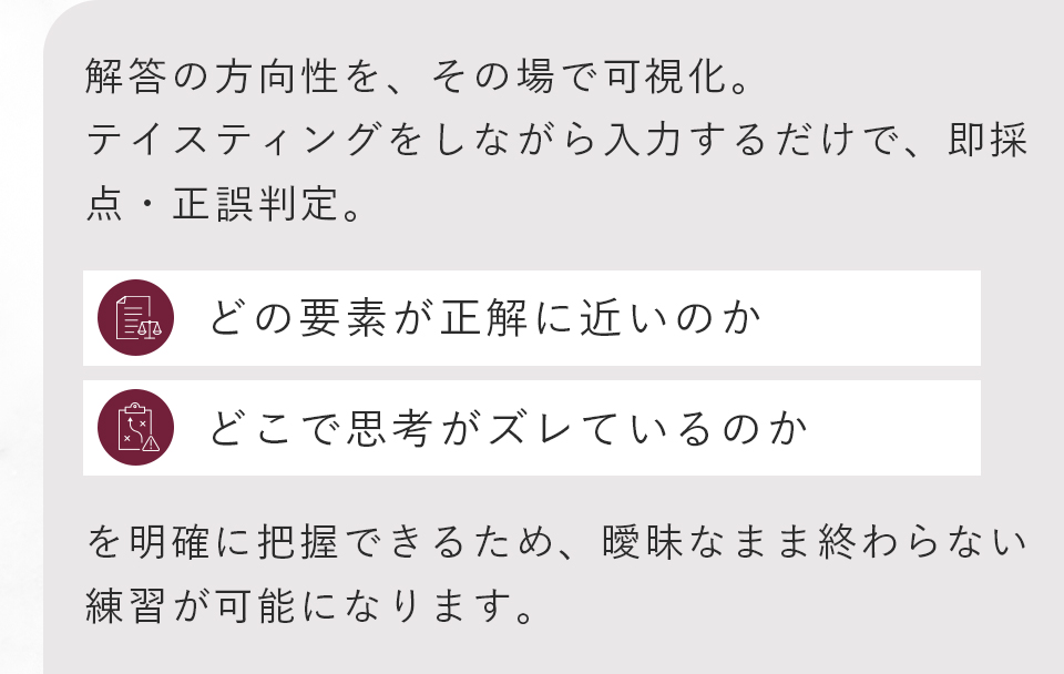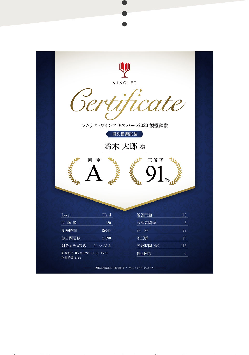 模擬試験実施後のアフターフォローの充実感!正解、不正解の問題を一覧で 確認する事ができ、不正解だった問題はすぐにリベンジ可能! 全問題に解説&ヴィノテラスオリジナルテキストの該当ページ(※)が 掲載されているから復習も簡単にできる!!