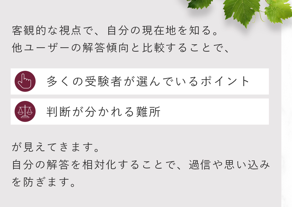 問題毎に他のユーザーの全体の正解率を見ることができます。 多くの人が間違える難問なのか、誰もが正解する重要問題なのか一目でわかり、効率よく復習できます。